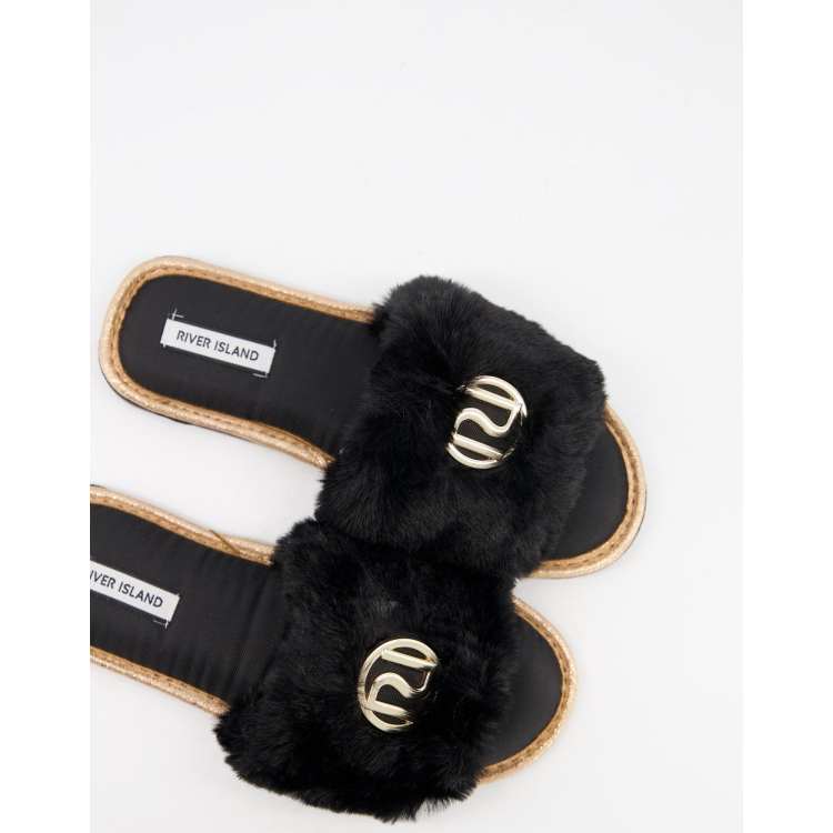 River Island Ladies Black Faux Fur Slip On Sliders Sandals UK 6 39 Very well made.