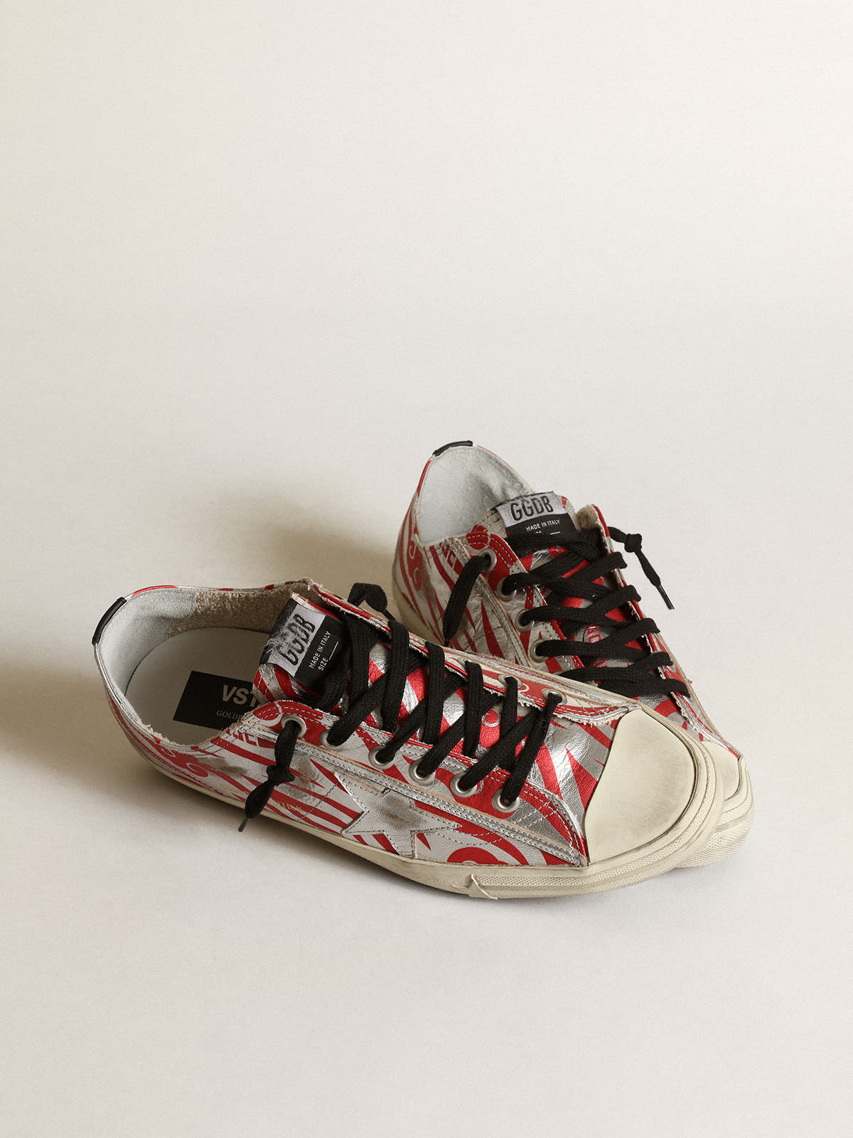 Men s V Star LTD in silver and red laminated leather with tiger print Very well made.