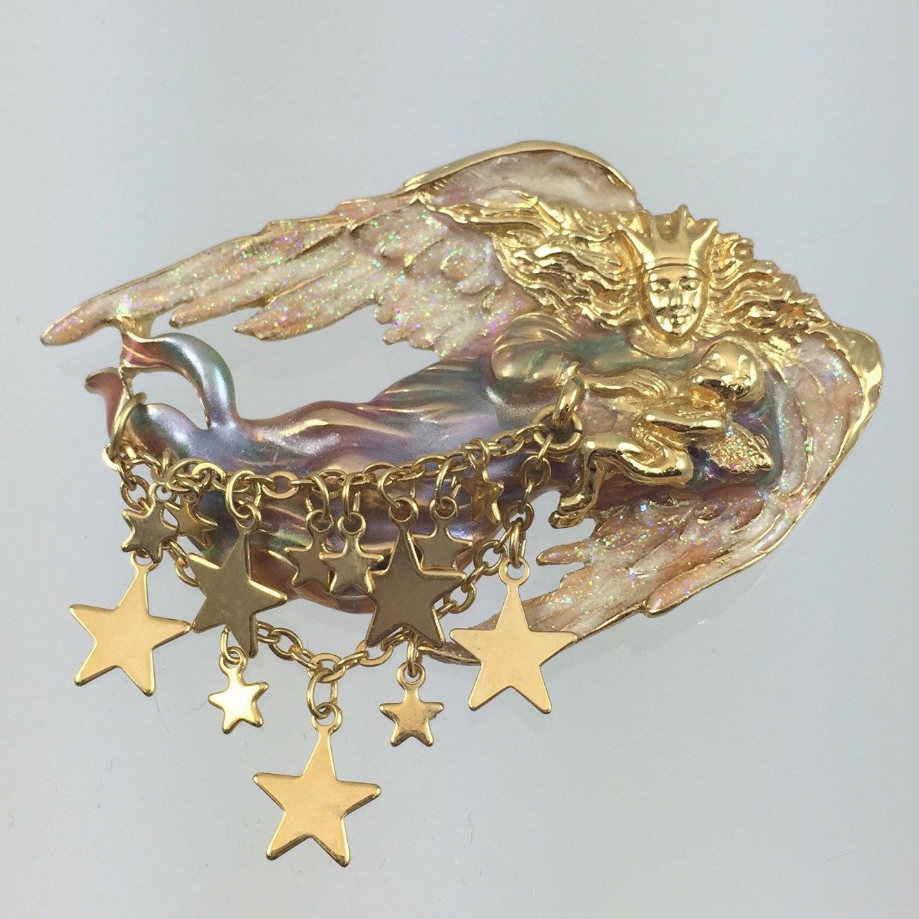 Vintage Retired Kirks Folly Baby Angel Brooch With Dangling Gold Stars Very well made.