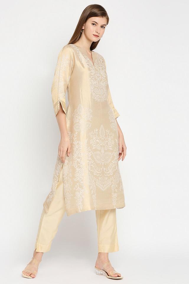 Buy CLOTH HAUS Off White Solid Brocade Round Neck Womens Kurti Very well made.