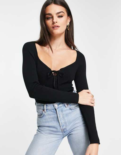 ASOS DESIGN Top in maglia con scollo a cuore e laccetti sul davanti nero Very well made.