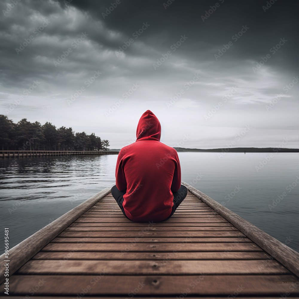 Young strong male man wearing a red hoodie sitting on a wooden Very well made.