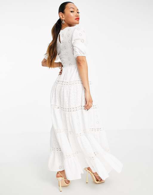 ASOS DESIGN Vestito lungo a balze in pizzo sangallo arricciato con inserti in pizzo bianco Very well made.