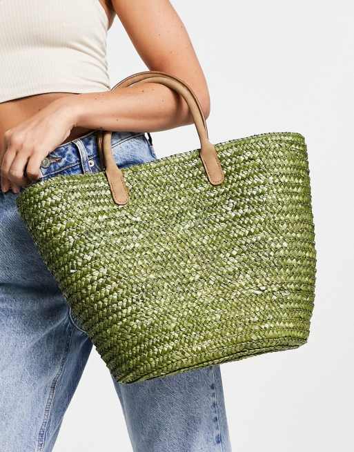 Woven Paper Straw Tote Bag with Lime Green Faux Leather Trim Very well made.