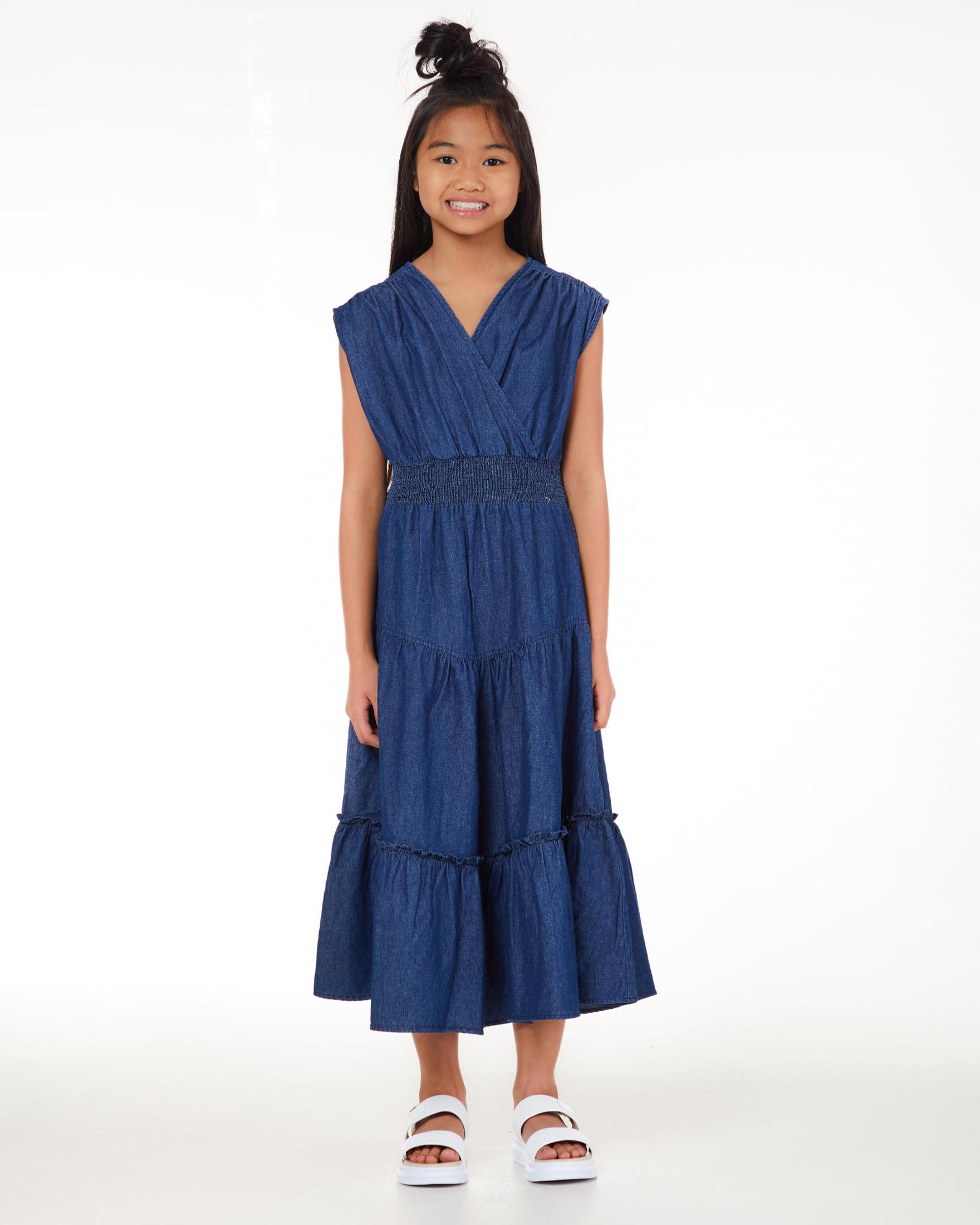 Abito lungo blu in denim di cotone senza maniche con balze 10 14 anni Very well made.