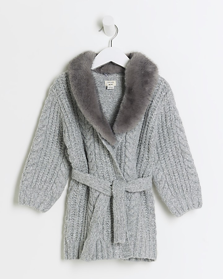 Mini girls grey faux fur cable knit cardigan River Island Very well made.