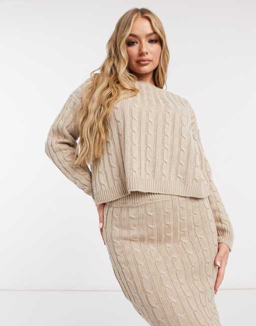Femme Luxe cable knitted jumper and midi skirt co ord in biscuit Very well made.