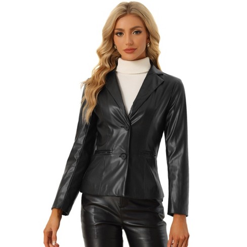 Allegra K Women s Notched Lapel Single breasted Faux Leather Very well made.