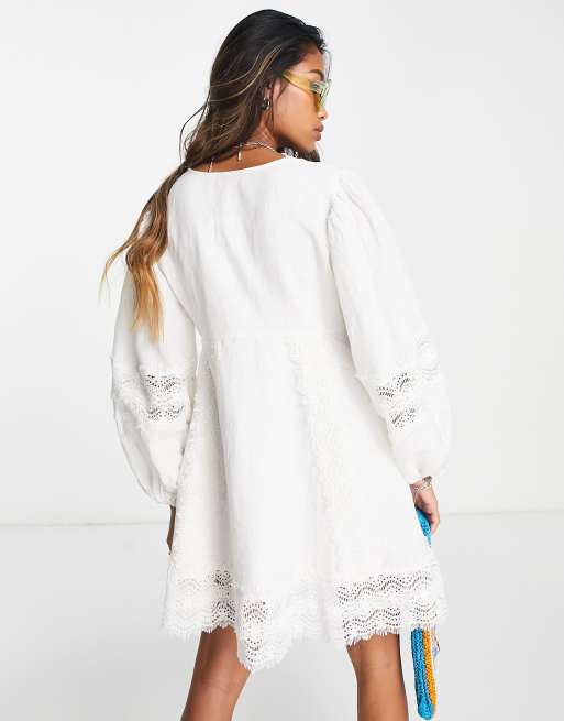 Topshop lace trim v neck long sleeve tea dress in ivory ASOS Very well made.