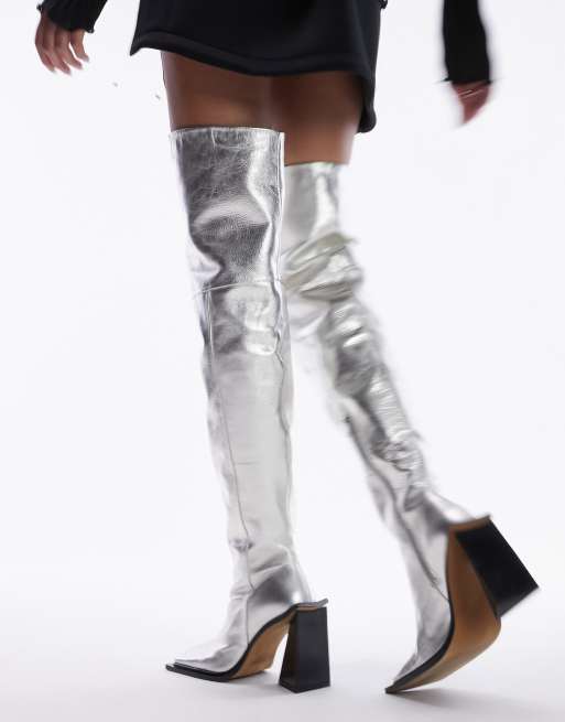 TOPSHOP LIMITED EDITION Freya premium leather thigh high square toe boot in silver Very well made.