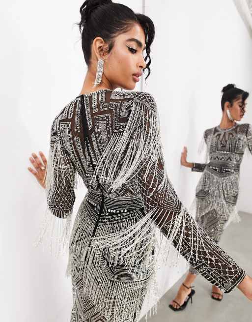 ASOS EDITION Vestito midi fasciante nero con frange perline e Very well made.