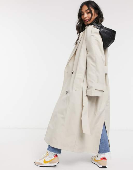 ASOS DESIGN trench coat with detachable leather look hood in stone Very well made.