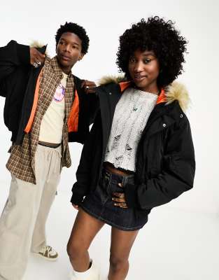 COLLUSION Unisex nylon bomber jacket with faux fur trim hood in black Very well made.