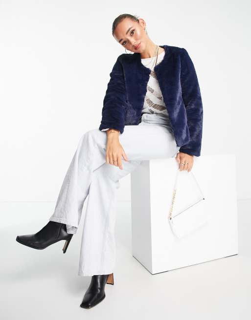 Unreal Fur collarless faux fur cropped jacket in navy Very well made.