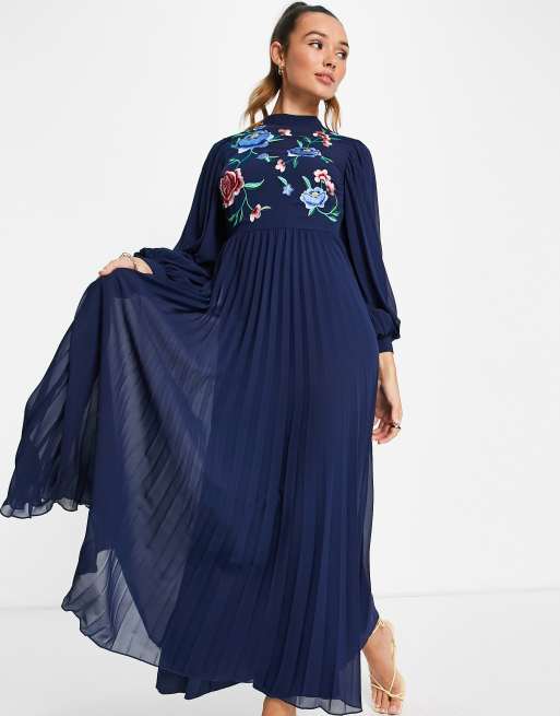 ASOS DESIGN high neck pleated long sleeve skater maxi dress with embroidery in navy Very well made.