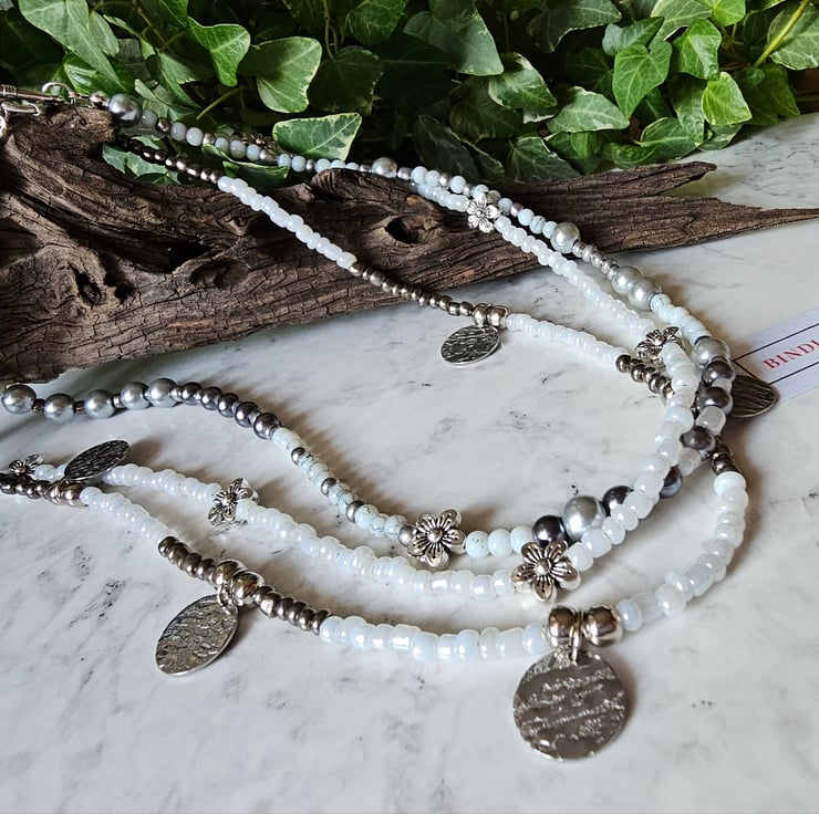 Multi strand bead necklace stacking layered pearl charm triple strand Very well made.