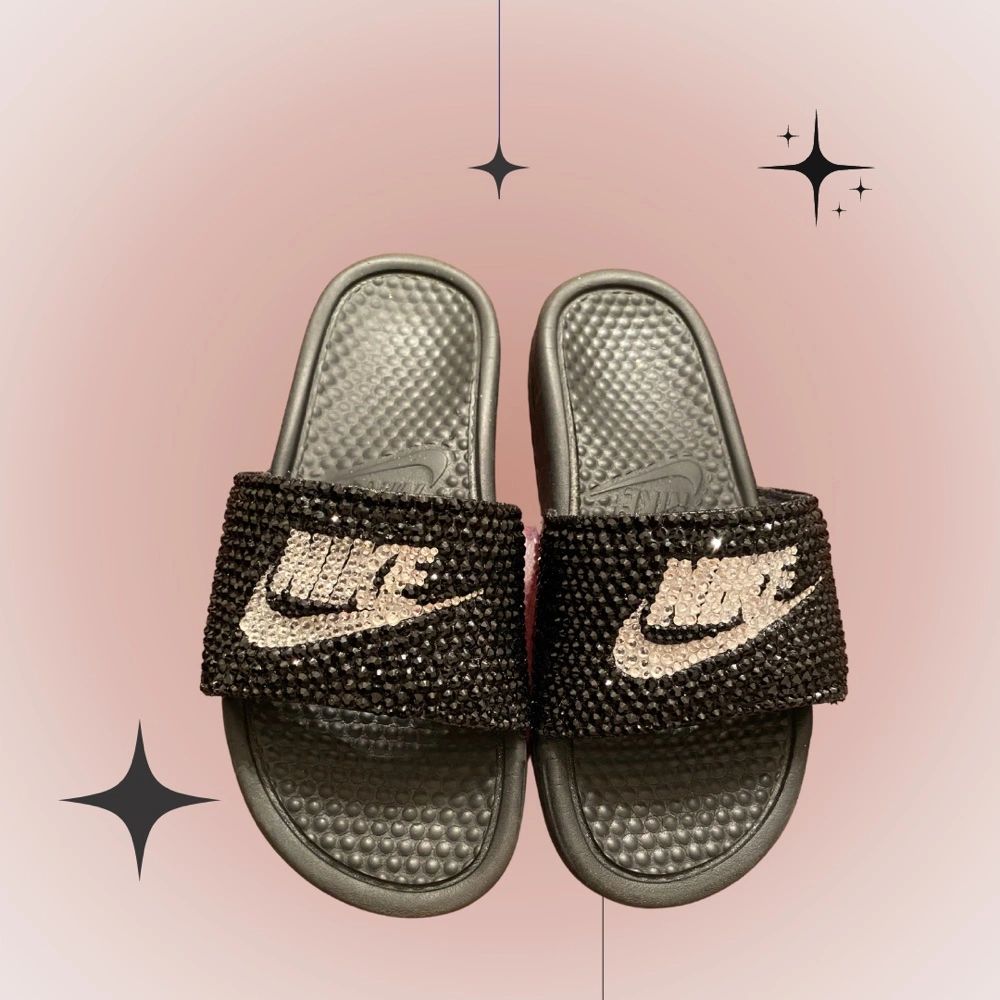 Bedazzled Nike Slides made with Swarovski stones pearls and Very well made.