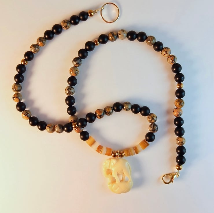Vintage Carved Bovine Bone Elephant Necklace and Earrings Set Very well made.