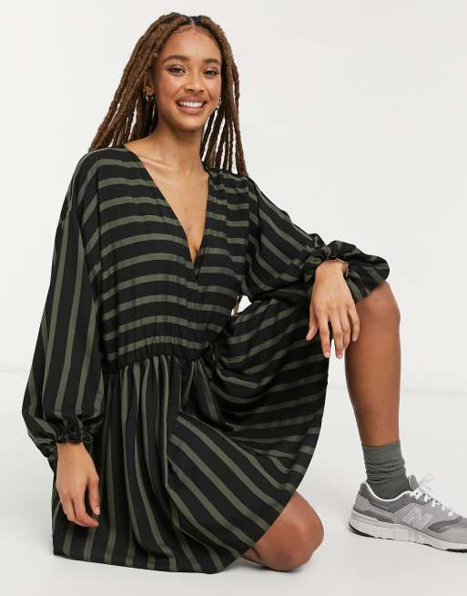 ASOS DESIGN casual oversized mini smock dress in khaki black stripe Very well made.